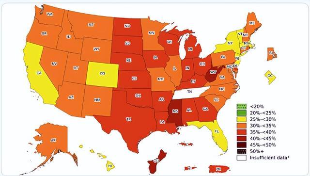 根据世界肥胖联盟的数据,2025年中国的肥胖率是9%。美国的肥胖率几乎是中国的3倍。而在美国最胖的州,密西西比、西弗吉尼亚、关岛,肥胖率甚至冲破了40%大关,几乎每俩人就有一个大胖子。