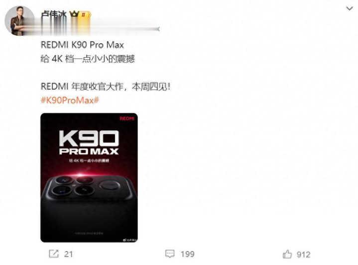 10月20日,小米集团总裁卢伟冰发动态宣布:“REDMI K90 Pro Max给4K档一点小小的震撼”。这台被称为“REDMI年度收官大作”的手机,将于本周四正式亮相。